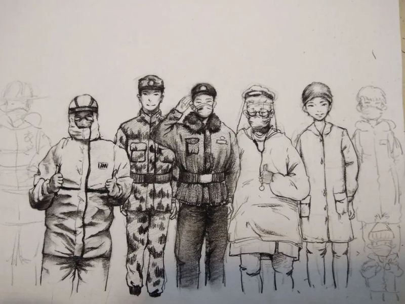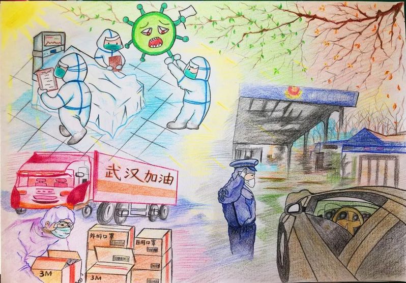 在“疫情绘情”的环节中,18、19级同学通过绘画的形式,将自己在疫情时期的所见所闻展现在画纸上,将医护人员义务反顾的身影和人民警察始终坚持在一线岗位的无畏表现得淋漓尽致,同时表达了学生们对奋战在一线工作人员的感动与敬佩之情。