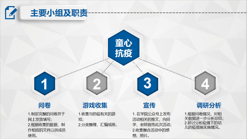 此次活动分为三个阶段,第一阶段为调查准备。团队采取线上线下相结合的方式,通过问卷组和游戏组的调查从而对相关数据进行收集。第二阶段为数据分析。综合问卷组的102份有效问卷以及游戏组收集的防疫游戏,研究发现在疫情常态化复学情况下,幼儿园采取每天入园测量体温等多方位的防疫措施,将教育课程以及园内环境创设与疫情防控措施紧密结合。另外,幼儿园结合不同年龄段幼儿的认知发展特点,带领幼儿进行不同阶段的防疫游戏,如小班进行手指操游戏、中班进行防疫儿歌传唱、大班举行防疫小知识问答比赛。同时,为加强防疫教育效果,幼儿园还对家长进行了教育普及工作。第三阶段为实践总结。团队各成员对自己在社会实践活动的所做所思进行分享交流,最后由杨步老师进行点评,杨老师肯定了大家的辛苦付出,同时也希望同学们能继续努力,通过本次暑期社会实践活动能真正做到学以致用,以实践促学习,以学习报社会。