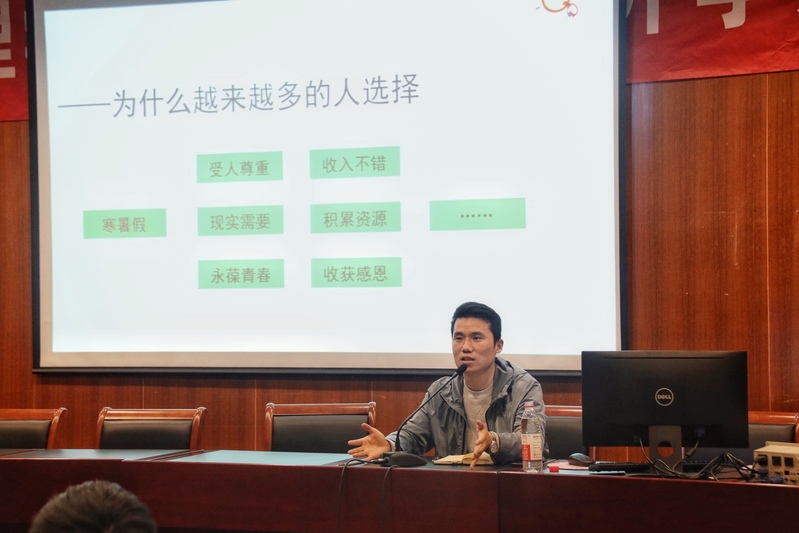 讲座伊始,王仁超老师听取了同学们对“幼儿教师”这一职业的困惑和看法,并结合了自身的专业选择和成长经历,耐心的为同学们分析和解答问题,详细阐释了学前教育的发展潜力和广阔前景。如何成长为一名优秀幼儿教师?王仁超老师围绕“沟通、多面、向上、向善”四个方面深谈幼儿教师角色带给个人的提升和成就感,寄予同学们“经常保持乐观、找到目标忙起来、人际关系要搞好,学习工作放首位“,并强调明确目标的重要性。讲座互动环节,同学们纷纷提问,现场氛围热烈。