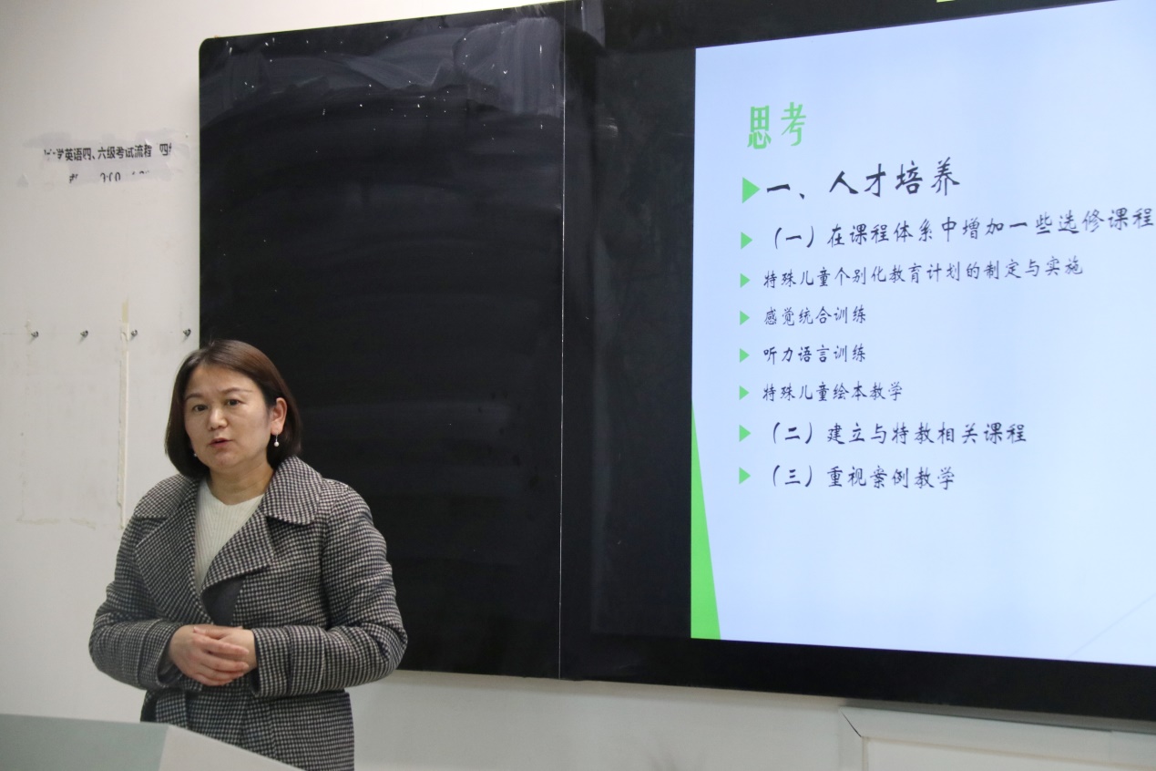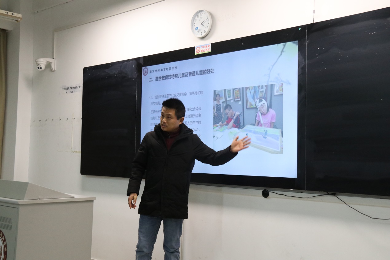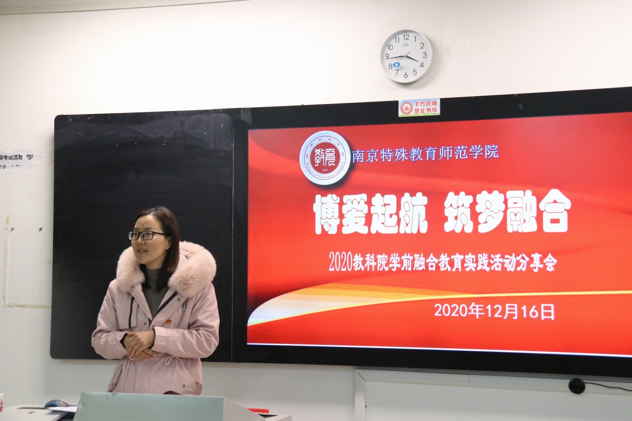 最后,教育课学院欧阳新梅和美术学院吕艺征老师进行融合教育经验分享的微讲座,展示了理论研究者关注学前融合教育实践的坚定使命和责任感。欧阳老师结合参与南京市随班就读指导中心组织的“南京市融合教育示范校评估”的经验,介绍了融合幼儿园的资源教室环境创设和利用情况,分析了南京市学前教育领域随班就读开展的现状;吕艺征老师结合河南省驻马店师专幼儿园实施融合教育的经验,分享了园长在融合环境创设的独特思考,为我院实验室建设和人才培养方案修订积累了有益经验。