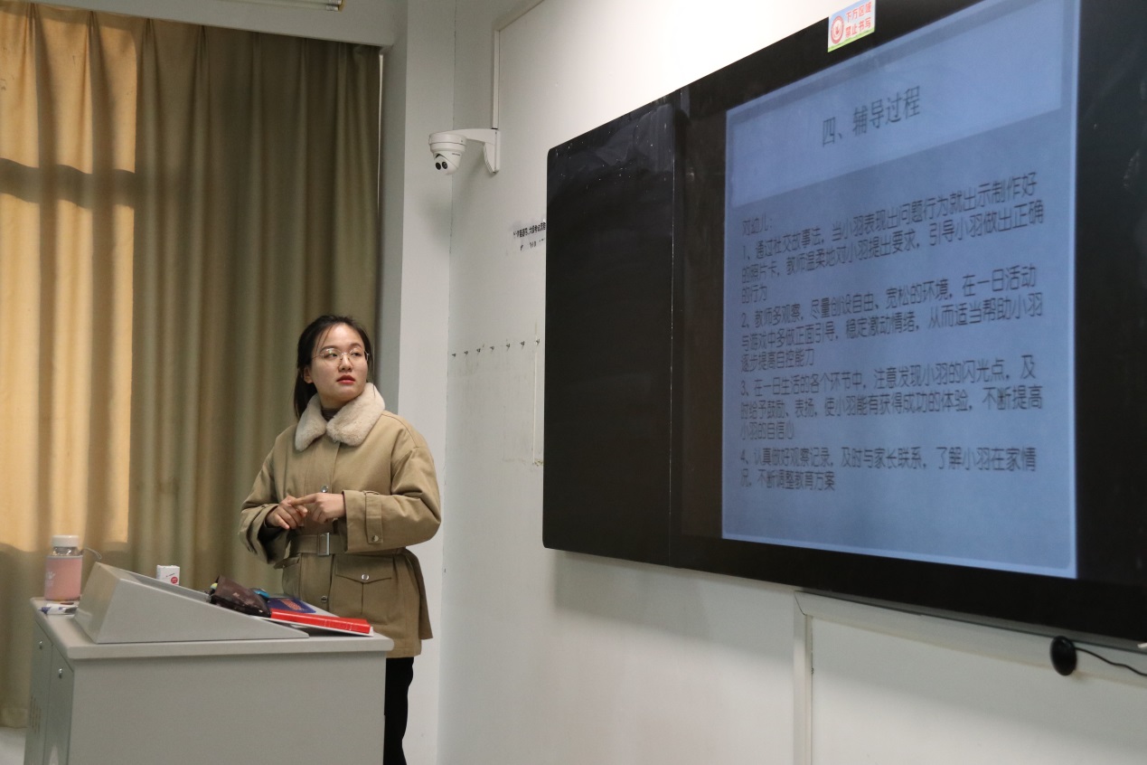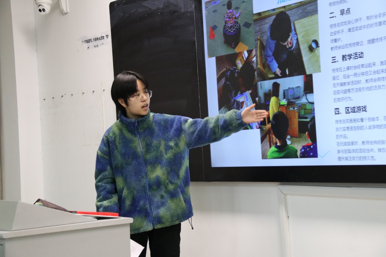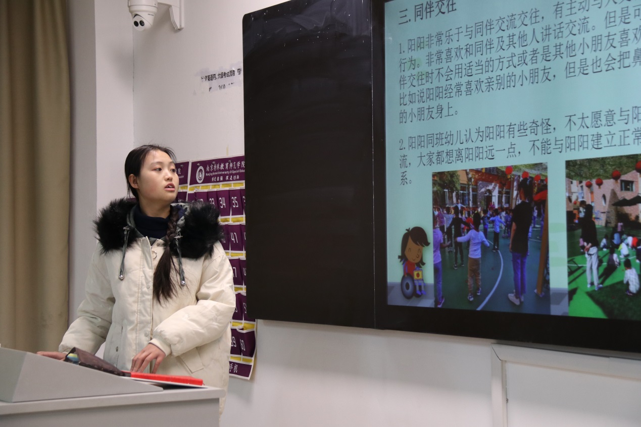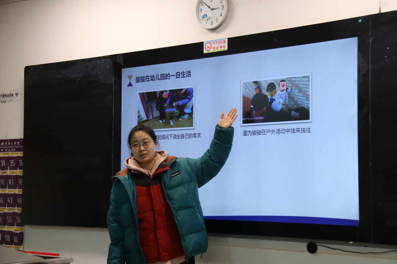 师生互动环节,学前教育专业17级本科实习生和18级见习生团队合作、精心准备PPT,分享了到南京市普通幼儿园、融合幼儿园、康复中心幼儿园和特殊学校与特殊幼儿亲密互动的经历与感受。学生汇报既有认真观察特殊幼儿一日生活的感性描述,也有虚心学习带班教师指导策略的理性思考,更有积极尝试与班上教师合作实施早期干预的有效互动。郭慧琳同学对康复中心的自闭幼儿的个别教育的全过程进行了完整汇报,焦雪昕同学对自闭症幼儿一日生活的过程进行了非常详细地记录和分析,李迪同学将班上教师和资源教师共同为自闭症幼儿干预的过程绘制成图表分享。同学们在走近融合教育实践现场、感受融合教育环境和亲身体验融合教育活动的过程中,树立了为所有幼儿服务、积极投身融合实践的教育情怀,感受了融合校园文化的独特魅力。