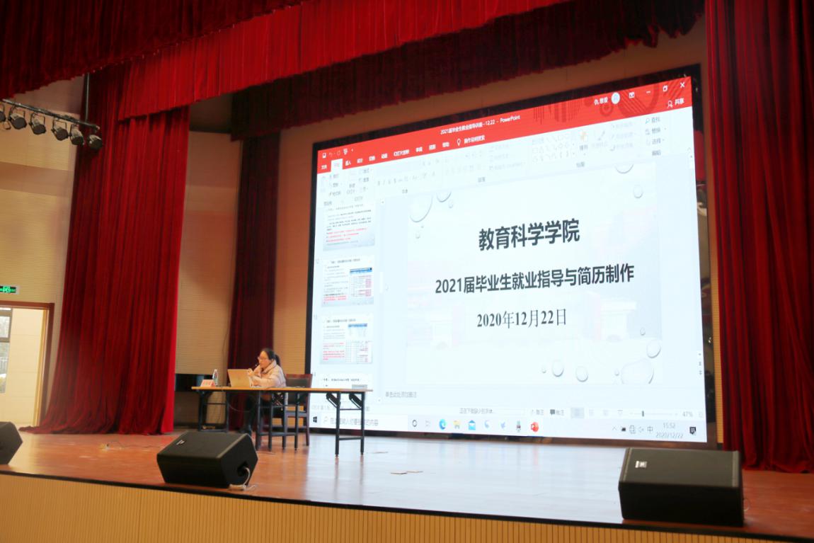 为了让2021届毕业生更好地了解相关就业政策,认清就业方向,做好就业准备,德赢VWIN于12月22日下午14时在实训楼报告厅举办2021届毕业生就业指导与简历制作讲座。本次讲座由教科院学工办主任李国敏老师主讲,17级辅导员汪亮巧,符煜叶以及学院2021届全体毕业生参加。