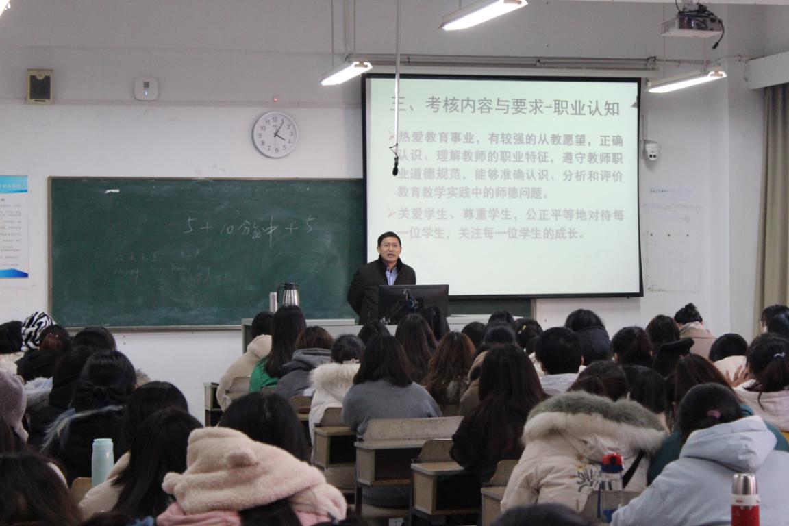12月31日下午,德赢VWIN在博雅楼2514教室举行教师资格证面试讲座,本次讲座旨在帮助在校学生熟悉面试流程,解答相关疑问。讲座由刘新学院长主讲,我院学生积极参与。