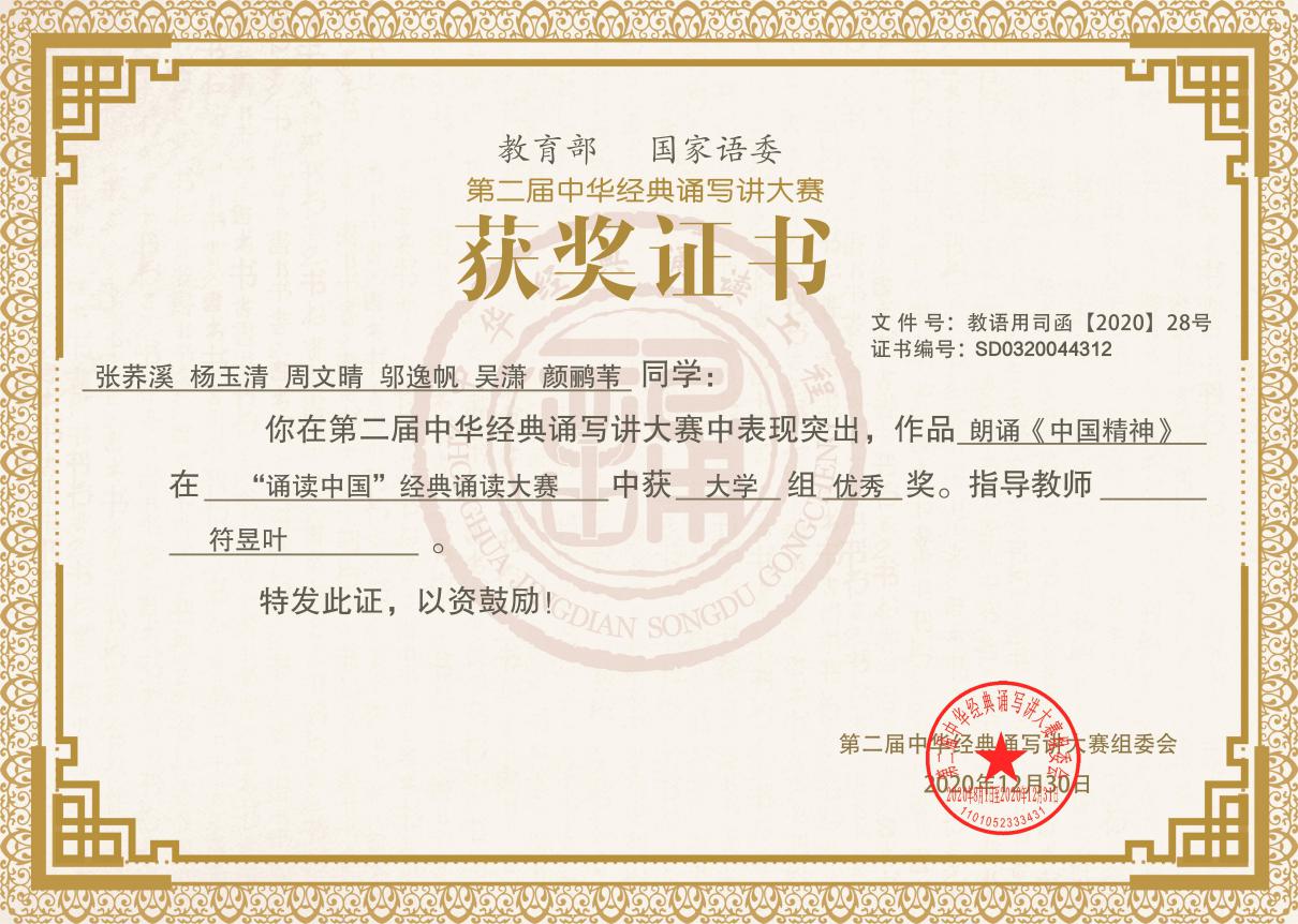 本届大赛由教育部、国家语委主办,主题为传承中华优秀文化,礼赞伟大时代精神。2020年5月至11月,第二届中华经典诵写讲大赛完成初赛(初评)、复赛、决赛(评审)、结果公示等工作。作品《中国精神》体现了该院残障大学生的语言文字应用能力,展示了残障青年自强不息、心怀家国的精神风貌,更彰显了当代大学生自觉传承弘扬中华优秀文化的责任感和使命感。(符昱叶)
