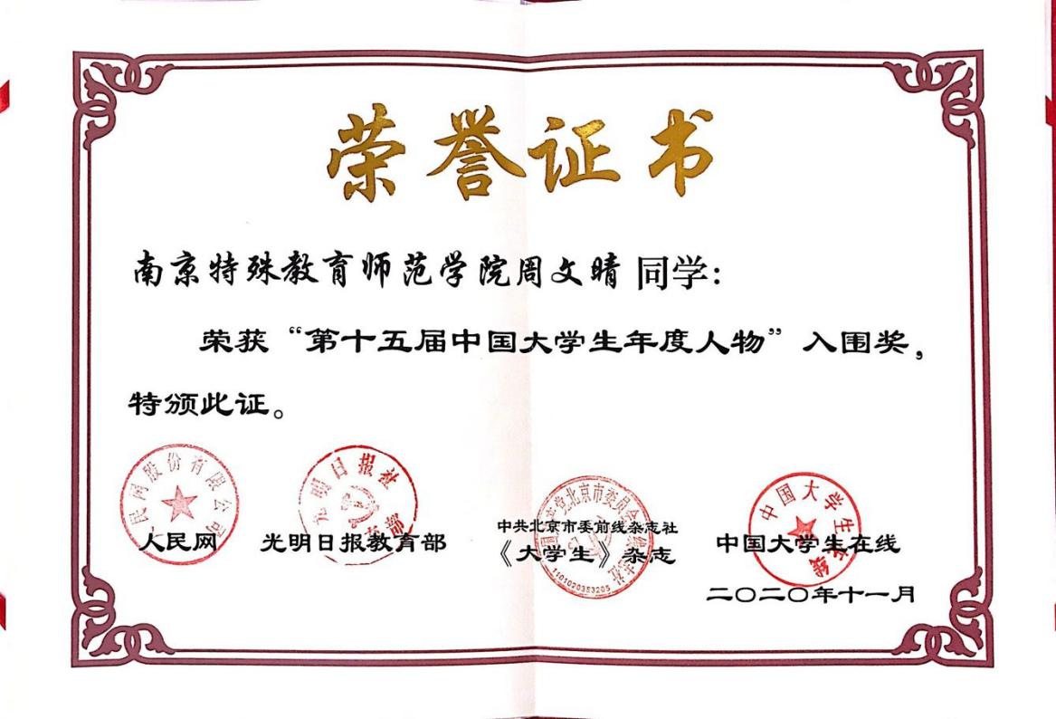 近日,在教育部、人民日报社共同指导,人民网、光明日报社教育部、《大学生》杂志和中国大学生在线联合主办的“第十五届中国大学生年度人物推选展示”活动中,我校教育科学学院学生周文晴喜获“中国大学生年度人物”入围奖。