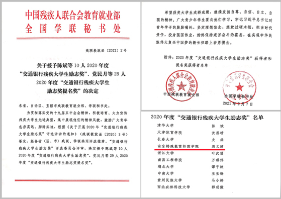 近日,由各省(区、市)残联、学联共同评选推荐,“交通银行残疾大学生励志奖”评审委员会评审,2020 年度“交通银行残疾大学生励志奖”获奖名单揭晓,德赢VWIN周文晴同学位列其一。