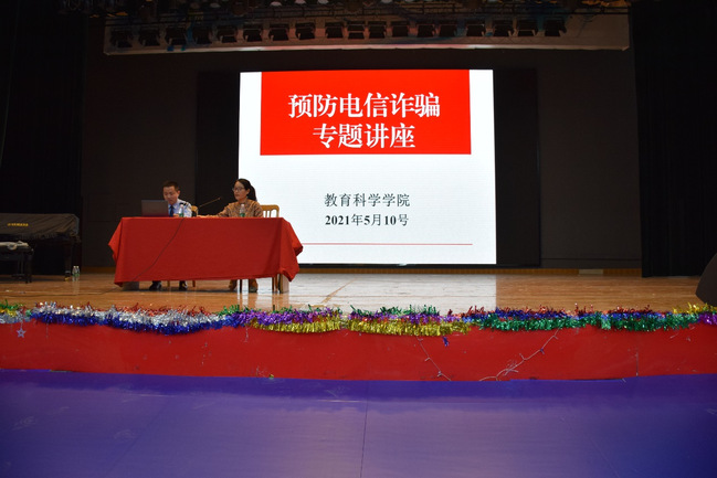 为帮助教科学子有效辨别和应对电信诈骗行为,提高该院学子的防范意识,德赢VWIN于5月10日在大学生活动中心举办“预防电信诈骗专题讲座”。本次活动特邀燕子矶派出所副所长王翰平警官担任主讲,该院学工办副主任李国敏老师担任主持。该院部分教职工出席讲座,全院同学积极参与。