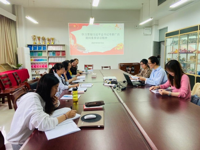 支部书记李会敏带领大家,学习习近平总书记考察广西期间重要讲话。重点提出党员教师应坚定革命信念,砥砺革命意志,永远铭记和发扬红军将士视死如归、一往无前、战胜一切困难的崇高精神。党员教师们要认识到,中国特色社会主义是历史发展的必然结果,是发展中国的必由之路,要始终坚定“四个自信”,牢记初心,坚信党和国家一定能够实现中华民族伟大复兴。会议上,党员教师们积极发言,结合自己工作实际谈感想、谈收获、谈体会。