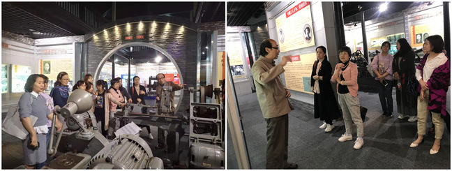 基地工作人员向全体教师的到来表示热情欢迎,并由讲解员宋老师带领大家参观了“金陵兵工展览馆”。南京晨光机械厂(前身系清朝洋务运动时期李鸿章于1865年创办的金陵机器制造局),在不同历史时期该机械厂为国家做出了重要的贡献,如承制了中央人民政府赠送给香港、澳门特别行政区礼品“永远盛开的紫荆花”、“盛世莲花”,设计研发了“奥运火炬的点火装置”等。金陵机器制造局不仅是南京地区的一个老军事工业基地,也是我党工人运动的重要场所,是中共南京地方组织革命斗争地。讲解员讲述了在雨花台牺牲的中国共产党党员孙津川烈士、梁永烈士生前曾在金陵机器局宣传革命真理,领导工人斗争的故事。在场教师无不被工人们所展现的战斗意志和不屈精神鼓舞,大家一起听红色厂歌,高唱红歌,现场气氛热烈而庄重。