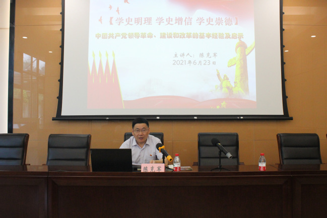 6月23日下午,南京特殊教育师范学院党委常委、副校长陈克军在教学实验实训楼103会议室为德赢VWIN全体师生党员上了一堂题为《中国共产党领导革命、建设和改革的基本经验及启示》的专题党课。