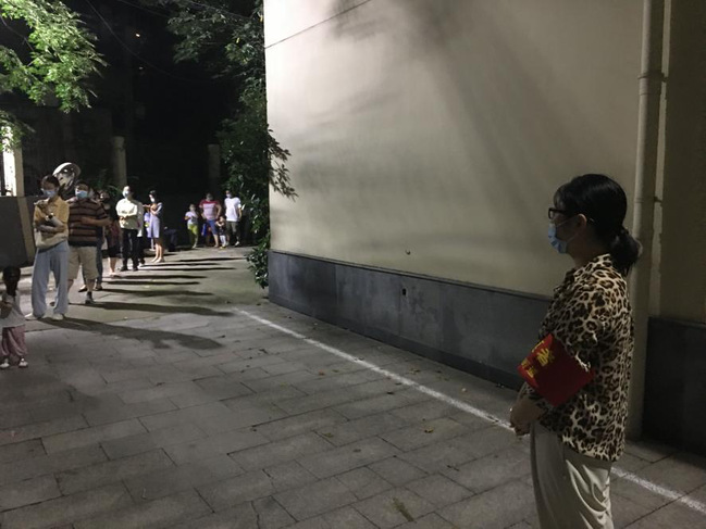 副院长(挂职)秦奕老师负责维持监测点的秩序,和其他志愿者一样,她戴上红袖章和口罩,做了手部消杀,利用手势和标志线安排居民有序进入检测现场,并引导他们完成检测后从规定通道离开。秦奕老师还时常提醒队伍中的父母做好孩子的防护。当谈及做志愿服务的切身体会,秦奕老师感慨良多,她说,深深感受到了志愿服务是有温度的,需要足够的耐心,天气炎热、排队时间长、细节繁多,诸多问题让居民们极易出现不满情绪,秦奕老师都耐心进行疏导,特别重点关注了残疾人、孕妇和带婴儿车等有特殊需要的居民,另外,她还十分关注细节,严格遵照疫情防控要求,避免检测过程出现交叉传染。