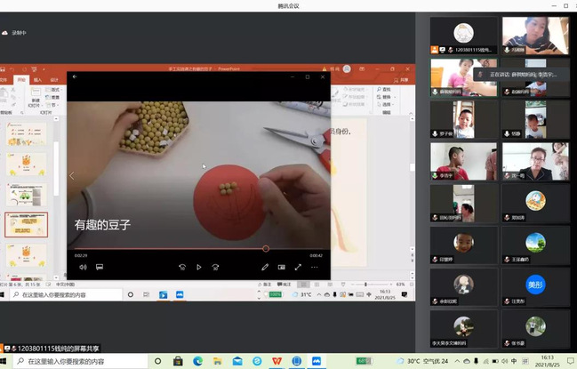 冯湘琳同学是该院学前教育专业大二的同学,她为特殊孩子带来的是豆子画手工课程,首先她通过提前录制好的视频,深入浅出地为孩子们演示了如何用卡纸,双面胶,黄豆等身边随处可见的材料,通过双手将它们组合在一起变成好看又有趣的豆子画。这节课,她耐心指导特殊孩子在家长的配合下,用一粒粒黄豆排列组合,在红色卡纸上做出党徽的形状,这节课生动有趣,很好地促进了特殊儿童的手眼协调能力和精细动作发展,直观体验式课堂使得党徽形象在特殊儿童心中扎根。课程结束后,家长纷纷发来孩子豆子画作品,收获满满。