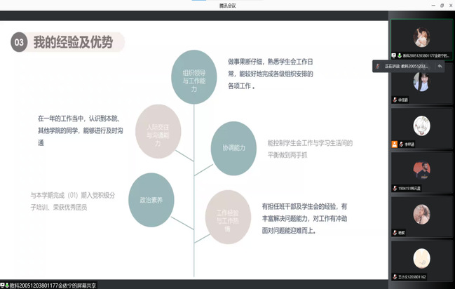 本次换届主要分为院学生会、院融媒体中心、院实践中心、院青年志愿者活动中心换届选举四个学生组织。经过前期的自愿报名和资格审核,候选人通过PPT进行个人经历、工作优势和工作设想三方面的汇报。随后,通过答辩环节,老师和主席团对候选人们的领导、组织、协调、交际等各项能力进行了进一步的考核。