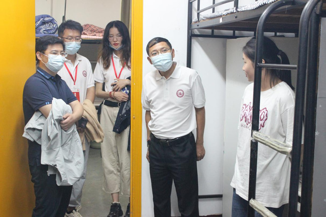 为深入了解新生住宿情况,关心新生学习与生活,进一步落实迎新工作,10月13日下午,德赢VWIN党总支书记吴月华、院长刘新学,党总支副书记吴兴、副院长徐莉、张丽莉和学工团队共同前往新生宿舍,走访看望21级新生。