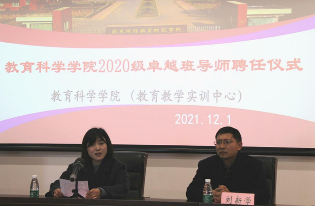 刘新学院长全面介绍了卓越班的基本情况及其规划,刘迎杰老师作为卓越班导师代表发言,提出导师应在了解学生的兴趣所在后,认真开展指导工作,在知识、能力、素质等方面展开针对性指导。同时,刘老师也对全体学生提出要做专业过硬,能力突出,勇担责任,追求卓越的新时代大学生的要求。南京市实验幼儿园黄菲园长作为实践导师代表发言,表达了希望与卓越班全体同学共同迈向卓越的愿望。卓越班学生代表钱纯同学首先对各位领导和导师们的付出表示感谢,接着表示将珍惜资源与机会,在导师们的帮助下对于专业有更多的思考。最后,她代表全体卓越班同学保证在未来的日子里将坚持不懈,不断突破自我,向优秀的教育工作者靠近。最后,刘新学院长为卓越班导师颁发聘书,全体师生合影留念。仪式最后,同学们与各自的导师进行更深一步地交流和了解。