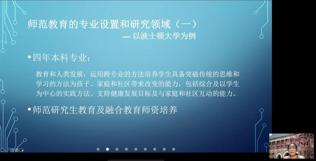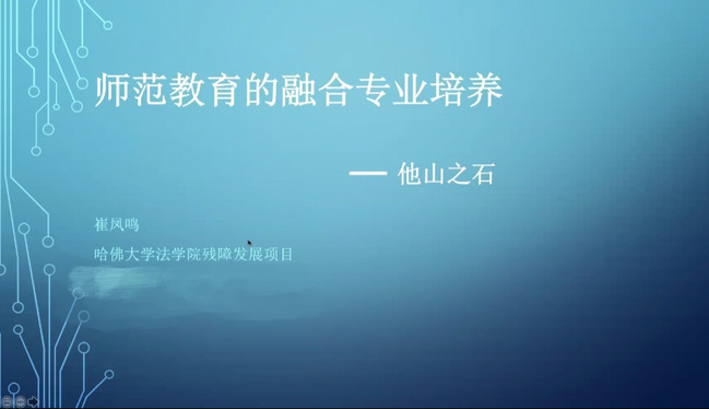 崔凤鸣博士现任哈佛大学法学院残障发展项目中国部主任。在讲座上,崔凤鸣博士作了题为《师范教育的融合专业培养》的报告。报告中,她从“作为教育工作者,我们当下做什么很重要?”的讨论切入,引导教师们对师范教育的愿景和使命展开思考,随后对师范教育的专业设置和研究领域、师范融合教育的专业优势定位、师范教育的通用学习设计、师范教育的学生多样性和差异性支持等方面内容逐一展开介绍。其中,以波士顿大学为例,对师范教育的专业设置、课程安排专业路径探索各方面进行了讲解,并对残障研究的概念、原则和国外嵌入残障研究的专业和课程发展进行了分享。
