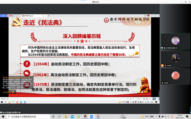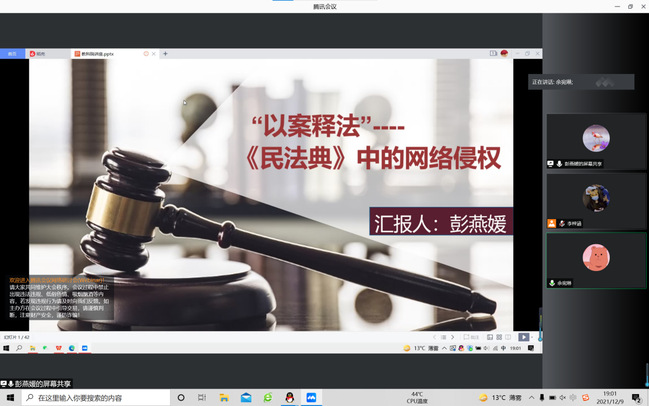 为了深入开展法制宣传教育,弘扬社会主义法治精神,进一步树牢学生的法制观念,努力构建和谐、平安、文明校园。德赢VWIN于12月13日线上举办“‘以案释法’——《民法典》中的网络侵权”法律宣传教育讲座。本次讲座由马克思主义学院彭燕媛老师主讲,德赢VWIN余宛琳老师主持,德赢VWIN全体学生参加。