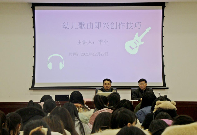 为了增强德赢VWIN学前教育专业学生的专业技能,加强学生幼儿歌曲即兴创作能力,培养高质量师范人才,德赢VWIN于2021年12月27日下午举办“幼儿歌曲即兴创作技巧”主题讲座,特邀北京太合音乐集团大石音乐音乐人李全老师讲授,德赢VWIN党总支副书记吴兴、辅导员余宛琳和2021级同学参与。