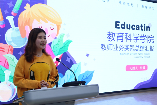 新进教师们就自己入职以来的思想政治学习、教学工作、科研工作等多方面的业务学习情况与大家进行了分享。首先,多位新进教师都提到了思想政治学习的重要性,汇报了自己对于在专业教学中渗透课程思政理念的学习情况和思考成果。接着,在教学工作、科研工作等方面,新进教师们纷纷表示学校层面组织的公开课展示活动、“老带新”的导师制指导计划、听评课活动以及学院层面组织的专家讲座、科研指导培训、课题申报论证会等,使他们从前辈教师那里听取了很多好的建议,提升了教学和科研能力。此外,张扬和杜婧两位本学刚刚结束在幼儿园挂职锻炼的老师,也专门从特殊儿童的早期融合教育实践分享了个人感触和收获。(文/张慧君 图/余宛琳 编辑/张慧君 审核/吴月华 刘新学)