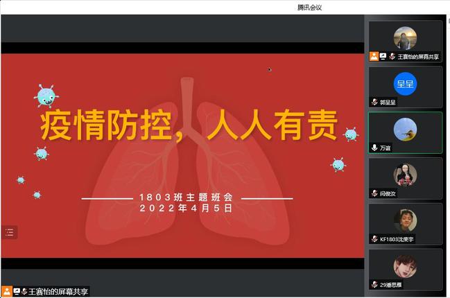 为更好落实学校疫情防控措施,提高学生防护意识,在关键时期织好织牢疫情防控网,德赢VWIN各班级于4月5日-6日召开疫情防控主题班会,该院全体学生积极参与。