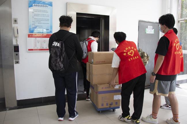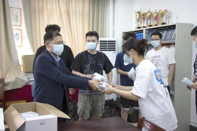 各辅导员老师带领学院学生志愿者进行物品清点和搬运,炎炎烈日也挡不住老师和同学们对防疫工作的热情支持。运输过程中,在学院领导关切及时的指导下,老师和学生互相配合,整齐有序地处理防疫物资。学院各年级班委代表,错时、错峰以班级为单位依次领取物资。发放物资时,刘新学院长亲切地询问同学们当前学习、生活现状,对于同学们上网课的学习效果、课余学习安排尤为关注,悉心的问候缓解了同学们在疫情线上课程期间的不安和焦虑。发放过程中,老师们细心详尽地安排,大大减少了酷热中活动进行的时间;学生志愿者们则不辞辛劳地搬运一箱箱防疫物资,其中装满的是学院领导和老师们对同学们的关切心意;各班学生代表有序排队,领取相应物品,相信现场其乐融融的氛围,一定能够融化疫情“坚冰”,用青春力量建设充满爱的校园。