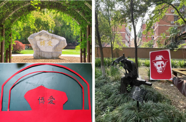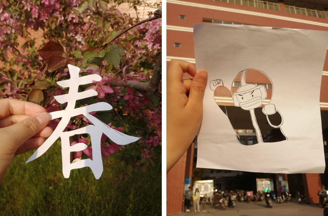 剪纸是我国古老的民间艺术,只借助一把剪刀、一张彩纸,就能塑造出一幅精彩的作品。教科学子充分发挥自己的想象力,各显神通。有的同学将生机勃勃的春日元素与我校“博爱塑魂”的校训相融合,为即将到来的校庆献上祝福;有的同学将在疫情中无私奉献的医护人员身穿防护服的身影描绘在白纸上,透过镂空的防护服可以看到校园中姹紫嫣红的春色;有的同学把“知识的海洋”的图书馆加以点缀,将安静、优雅描绘在纸上。