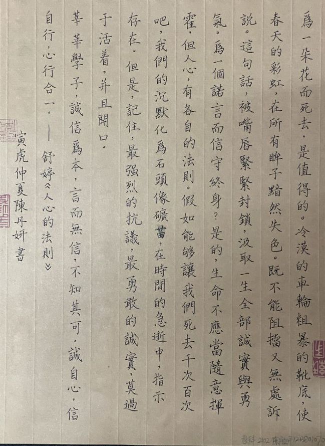 本次“立诚于心,树信于行”主题征文及书法比赛的成功举办,一方面,丰富了学生的课余文化生活,加深了同学们对“诚信”二字内涵的理解,培养了学生诚信守诺的优良品质;另一方面,有利于营造人人讲诚信的良好校园氛围,助力我院资助育人工作的具体实施,并进一步推深做实“三全育人”工作。(文/余宛琳 严诺兰 图/教科学子 编辑/余宛琳 审核/吴月华)