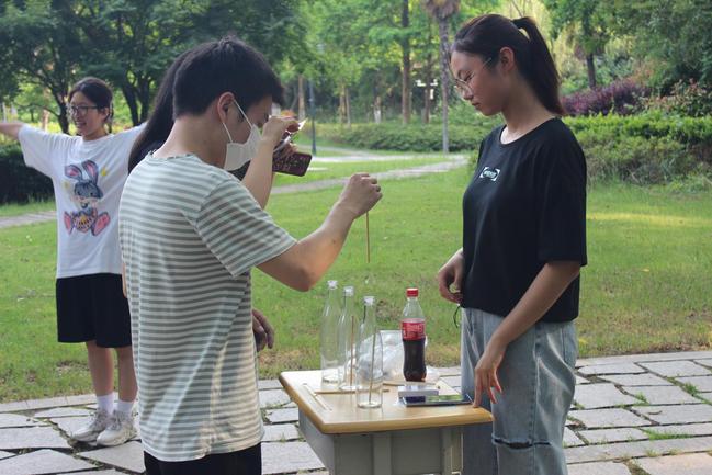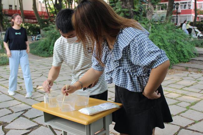 本次活动以游戏闯关的形式展开,由“心有灵犀”、“我的鼻子在哪里”、“海带啊海带”、“排排坐夹果果”、“背对背拥抱”、“你又是谁”、“谁比谁手抖”、“扑克炸弹”、“贴贴吧”等9个小游戏组成。在“排排坐夹果果”的游戏中,同学们分为两组进行夹弹珠比赛,需要组内一人将五个弹珠用筷子加入另一个空碗中,而另一人再将弹珠夹回之前盛弹珠的碗中,用时最少的一组获胜;在“谁比谁手抖”的游戏中,一组同学每人可以获得两根筷子,将筷子悬停在啤酒瓶上方,使筷子自由落体,使其掉入啤酒瓶中,四根筷子有一根掉入啤酒瓶中则算获胜。在游戏中赢得胜利便可以获得贴纸,并凭贴纸在签到处领取小礼品。活动现场呈现一片欢乐的气氛,同学们踊跃参加游戏,时不时传来阵阵笑声。在活动中,充分展现了大学生对童年的回忆,对童心的追寻,也是给每一位同学的礼物。