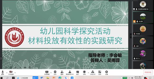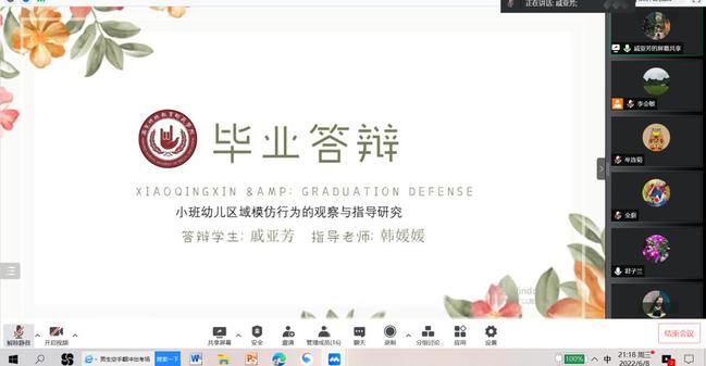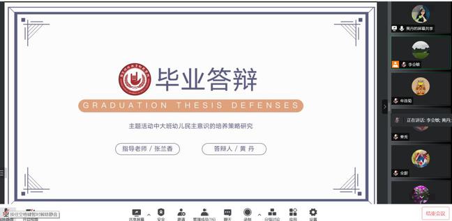 毕业论文是人才培养的重要环节,也是对学生专业知识、综合运用能力的全面检验。为确保我院2020级学前教育本科函授班人才培养的质量,结合我校继续教育学院的相关规定,我院于2022年6月8日晚,开展了成人高等学历教育函授本科毕业论文线上答辩。我院教师张兰香、李会敏、韩媛媛、牟连菊参加了本次答辩工作。