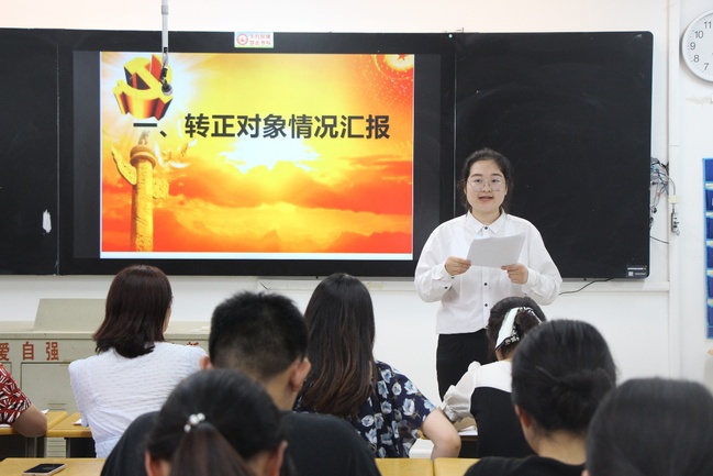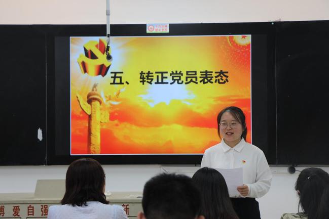 会议伊始,由会议主持人介绍大会各项事宜以及大会流程,宣读本次转正的预备党员名单。预备党员相继提出转正申请,汇报预备期中自己在思想、生活、工作等各方面的情况。随后由入党介绍人介绍情况,并对其能否如期转正表明意见。各位预备党员精神抖擞,有条不紊地进行本次大会。经过投票表决,34位预备党员均全票通过,如期转为正式党员。转为正式党员的同志进行表态。表明了他们对党的认识以及对党的十九大精神的理解,同时也表达了对今后学习、工作的想法与奋斗决心,坚定目标、严于律己,不忘初心跟党走,努力改正不足,积极向优秀共产党员学习。