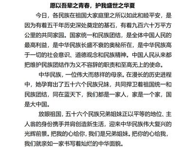 经过前期班委的宣传,同学们纷纷积极提交自己的作品。同学们围绕抗疫精神、民族团结等方面抒发了真挚的情感,阐述自己所理解的民族团结精神的内涵,充分表达自己对民族团结进步和建设和谐校园的期望。作品中同学们结合了自己的经历,宣讲身边人投身民族团结进步事业的真实事例、抒发对伟大祖国、中华民族、中华优秀文化的真实情感,反映出民族间友好互助关系。同时激发了师生的心灵共鸣,弘扬民族团结进步主旋律,引导师生牢固树立中华民族共同体理念。经过评委的认真评选,筛选出优秀作品报送学校。