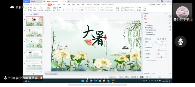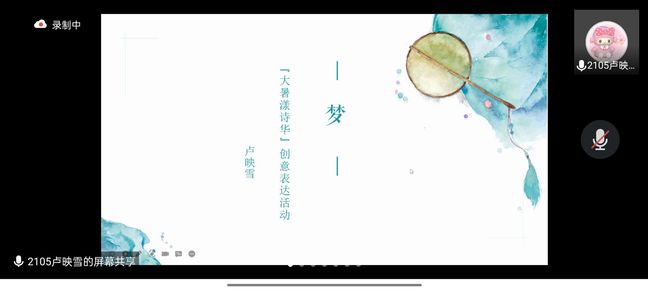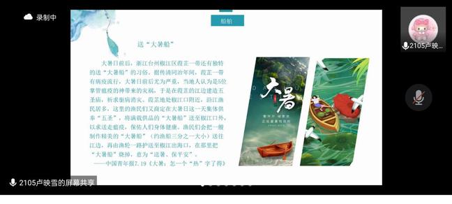 “赤日几时过,清风无处寻。”大暑是一年之中最热的一天,是二十四节气中最炎热的节气,湿热交蒸在此时达到顶点。暑气蒸腾,蝉鸣阵阵,正如诗文中所说清风无处可寻,但是我们可以乘一叶诗的小舟在文辞诗华的湖面上停泊,来享受诗意古风带来的阵阵清凉。本次活动共有15名同学参加,活动中同学们撰写属于自己的大暑纪事,书写大暑节气相关的三行小诗,文笔生动,诗意盎然。同时在线上腾讯会议借助视频、PPT、朗诵等丰富的形式展示作品。字里行间描绘出同学们心中的大暑和夏天。无论是在博物馆中寻访历史古意,还是泛舟湖上欣赏摇曳莲花,又或是遵循传统习俗感受传统氛围都展现了同学们丰富多彩的暑期生活,盛夏的酷暑难耐也被同学们的诗华巧思驱散。在这个夏天,在这个大暑我们共享诗的盛宴。