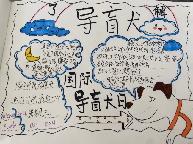 小钱老师教授的课程有绘本课《导盲犬斯特拉》《你我如此与众不同》《田鼠阿佛》,健康主题《情绪对对碰》。根据自己的专业优势,在传统绘本课中加入多样延伸活动,同时结合儿童特点设计了情绪管理《情绪对对碰》,通过情绪垃圾桶和情绪之花等设计,帮助学生们判断、管理不同的情绪。绘本课《导盲犬斯特拉》邀请同学们尽情发挥自己的创造才能,进行导盲犬宣传手册的绘制。同学们的作品令人为之惊叹!或强调遇见导盲犬的注意事项,或强调导盲犬的性格特征,或普及国际导盲犬日,从各个角度介绍导盲犬。