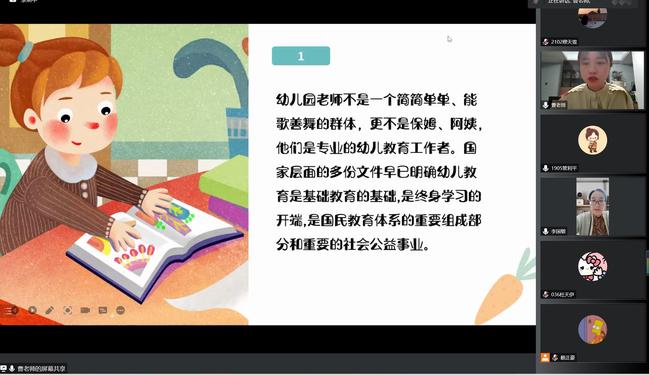 为了让同学们更加了解学前教育专业,提升专业归属感,更加热爱幼儿教师这一职业,德赢VWIN于10月7日晚在线上举办“幼儿园一日活动的组织”主题讲座,本次讲座由燕子矶幼儿园新城园区优秀骨干老师曹菁主讲,德赢VWIN全体同学积极参与。