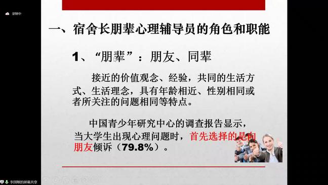 李国敏老师围绕“朋辈辅导”这一关键词展开培训,带领同学们正确认识大学宿舍对学生发展的重要作用,并详细地列举了朋辈心理辅导员的角色和职能。在了解了朋辈辅导员的重要性后,李国敏老师对心理健康的识别标准、心理异常的表现等都进行了耐心讲授,叙述了心理问题的处理方法和注意事项。通过此次培训,寝室长和心理委员进一步了解了各自的职责及发现问题的应对策略,掌握了基本的心理辅导技巧和心理调适方法,大家纷纷表示收获颇丰,相信他们将会用阳光、积极的心态科学开展心理自助及助人工作,为学校心理健康教育工作助力。