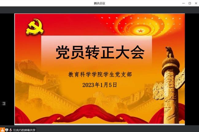 为进一步加强党员队伍建设,切实提高党员发展质量,德赢VWIN学生党支部于1月5日召开线上党员转正大会。本次会议由该院学生党支部书记汪亮巧主持,该院党总支副书记胡芳和各位入党介绍人老师出席,全体学生党员及参会。