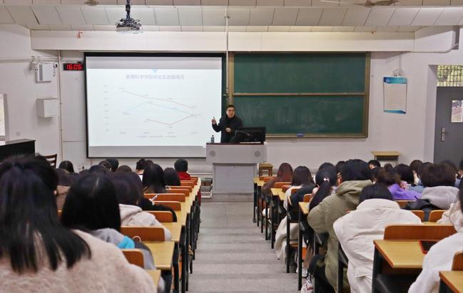 讲座伊始,郭建勇老师从23届毕业生面临的就业现实切入,结合教科院毕业生历年就业情况,提醒同学们要结合时代背景调整就业思路。接着,郭老师通过展示对十余位来自全国各地不满5年教龄老师的采访记录,阐释了教师工作内容的改变。与此同时,郭老师以近期讨论热度很高的ChatGPT为例,结合往届毕业生访谈视频,告诉同学们,一定要探索自己的兴趣和能力所在,思考自己与所选职业的适配度如何,寻找到自己真正热爱的事业。最后,郭老师给同学们提出几点建议来应对当前就业形势。一是要明确自己的优势职业领域,更擅长人、物、心智思考中的哪个领域;二是对于打算从事教育行业的同学,要明确教育应当回归建设性,在尊重个性化的道路上寻找答案,而热爱才是解决一切问题的答案;三是将求职视为职业探索的过程,不断建立人脉资源;四是注意鉴别父母的意见是否合理,在自己想做的事与父母的期望之间找到平衡。