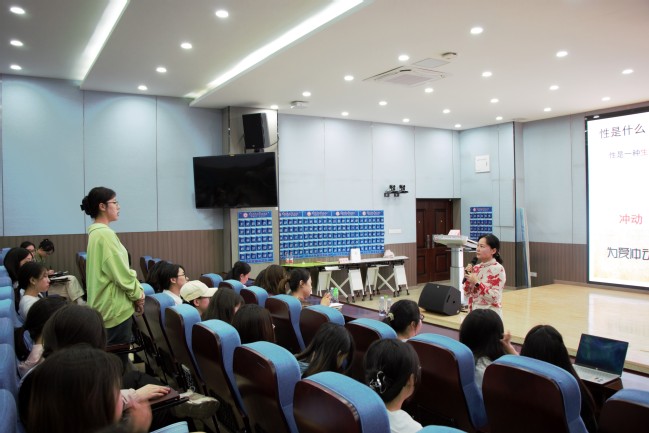 讲座开始前,徐青主任通过几个生动的案例引出话题,渲染了现场轻松的气氛。徐主任借助简洁明了的ppt讲述了青春期女生的身心变化、如何正确处理人际关系特别是早恋问题等,并通过问答形式引起同学们的思考——“女生应如何规划自己的未来”“女生该如何保护自己”,让同学们针对女性健康问题有了新思考。徐主任结合详实的数据资料与大量典型案例,以浅显易懂的讲述方式与现场同学们亲切互动,就女大学生身心特征、卫生保健、自我保护、如何正确看待并处理两性关系等方面作了细致讲解,引导大学生自尊自爱,自强自立,把握好自己美好的青春和前程。