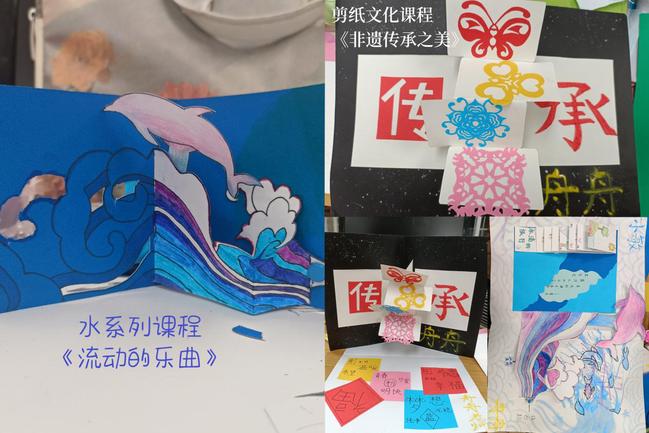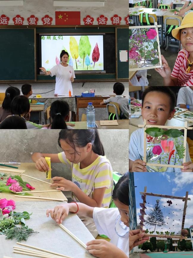 在绿水青山系列课程中,带领孩子们走过绵延环绕的群山,淌过纵横交错河流,抚摸茂盛生长的植物。志愿者米奇老师通过“书中自有万重山”的山系列课程,带领大家感受诗人眼中的山脉连绵,用视频和图片近距离接触于都屏山的郁郁葱葱,最后和孩子们一起用彩笔绘出诗意的青山,设计立体山机关赋予平面灵动的起伏。志愿者周雨萌老师通过“流动乐曲”的水系列课程,理论结合实践,从鄱阳湖到庐山瀑布,山野的长长细流到赣江的波澜壮阔,无论是有趣的吹画、科学小实验,还是瀑布抽拉式机关的制作,在带给孩子们新奇感和成就感的同时,教会孩子们水的变幻无常和包容万物。通过植物、动物系列课程,团队成员介绍了赣州于都的珍稀野生动物,跨越时间的长河,带领孩子们研究当地代表动植物的演变:水杉和银杏,远古的虔州龙和江西的省鸟白鹤,最后通过制作植物相框和立体机关记录这些动植物的精彩时刻,也把对家乡的探索“足迹”封存在孩子的内心。