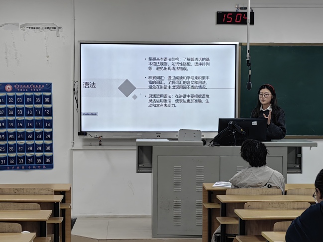 有的同学总结了关于普通话常见的发音、语调、停顿等问题,并从语速、音量、情感表达、用语规范等方面给出了具体的纠正方法。通过现场示范读、带读、练读等多种朗读方式,对学习普通话中容易出现错误的声母、韵母、语调,进行了个别指导和纠正。