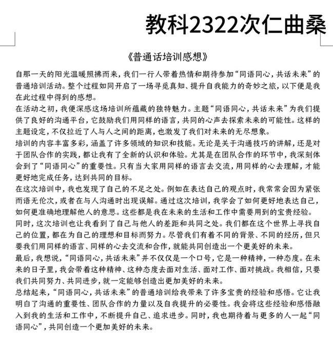 这种互助互学的精神,让整场分享会的氛围达到了高潮。大家纷纷表示,作为一名师范生,他们将肩负起教书育人和传承中华文化的重任,在未来的道路上不断努力,为建设教育强国贡献自己的力量。同时,他们也希望通过自己的努力,能够团结少数民族同学,共同建设美好的明天,为祖国的教育事业注入新的活力。会后,同学们写下了自己参加培训的心得体会。