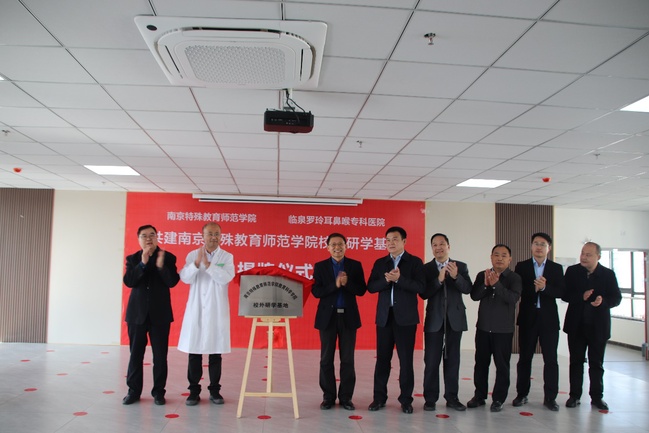 阜阳市残联领导还陪同刘院长到临泉县,赴临泉罗玲耳鼻喉专科医院考察,市残联领导、临泉县委常委统战部部长叶战伟、临泉县政府办公室副主任孙伟、临泉县残联理事长刘晋,临泉罗玲耳鼻喉专科医院院长张文法等参与学院校外研学基地揭牌,刘新学院长首先介绍了学院办学特色与专业优势,并提出以研学基地为依托,逐步推开合作领域,协同推进医院的聋儿言语康复、孤独症儿童康复与融合教育取得更好的发展。
