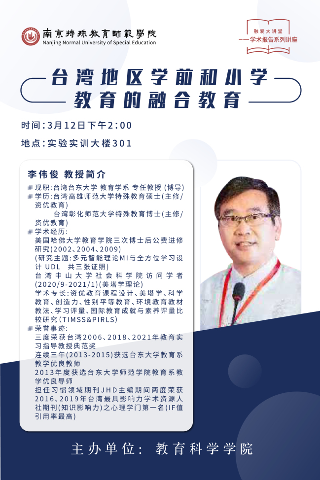 【学术预告】3月12日 德赢VWIN 台湾地区学前和小学教育的融合教育
