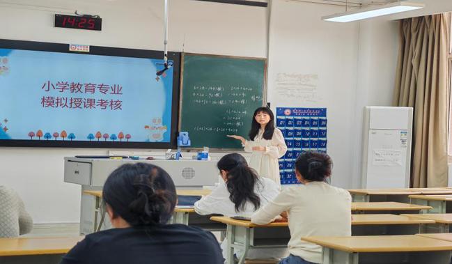在模拟授课教室内,同学们选定上课内容,开始模拟授课。从趣味导入到互动提问,从教具演示到分层任务布置,同学们灵活运用合作学习、情景教学等策略,展现了对课堂节奏的精准把控,也展示了小教专业同学扎实的基本功。