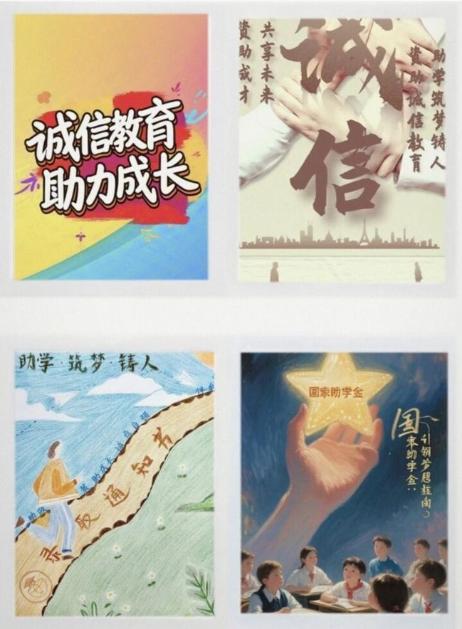 与此同时,在5月23日至30日,“资助诚信教育”主题海报设计活动吸引23、24级学生广泛参与。活动中,同学们充分发挥专业特长与创意灵感,通过视觉艺术将诚信、感恩与风险意识融入作品,既展示了才华,又以直观形式传播了资助政策的核心精神,进一步丰富了校园文化载体。
