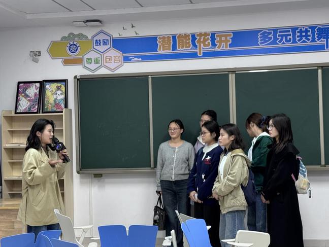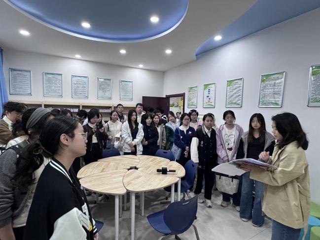 随后,师生队伍移步至学校的融合教育资源中心,由我院优秀毕业生——严欣老师负责讲解。严老师不仅概述了中心的发展历程与整体运作情况,更引导大家逐一参观了感统训练室、个别化辅导室、资源教室等多种功能空间。她现场展示并讲解了多种特制教具,让同学们对融合教育的“精准支持”有了更为具象化的理解。
